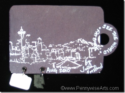 Two darling shrink plastic charms hang from the edge. The Mount Rainer one is shown clearly, the Washington one is black and blends into the background of the photo. And when I saw what Julie was up to I knew I had the perfect stamp for her to use on the backs of her tags! It’s an old unmounted stamp, so I am not able to give it credit.